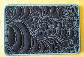 Then there was a bit of a pause, until the THIRD one arrived!  Below, a beautiful feather from Marelize Ries in South Africa, quilted with a shimmery silk thread in a soft teal on a deep teal fabric, love the color choices, which look deeper and more mysterious in real life.